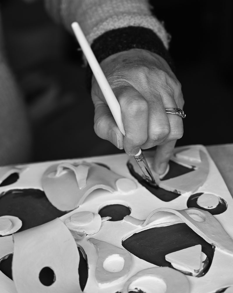 She mainly hand-builds vases, pots, sculptured pieces and tiles using porcelain paper clay and porcelain.