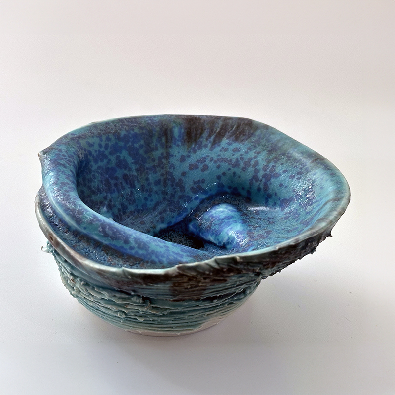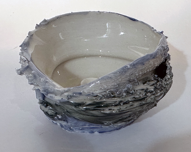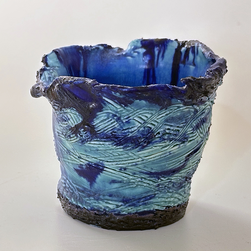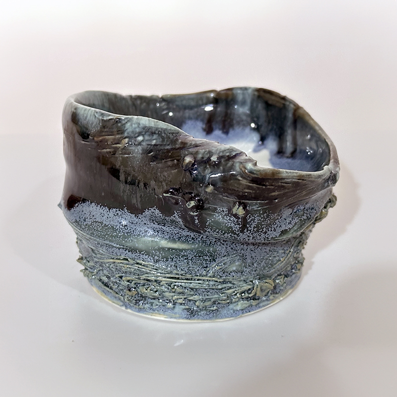 “Using decorative colours, not reliably food safe, I’ve overlaid them to increase their range and patterns with use of (manganese) oxide to reflect the rocks surrounding the sea.